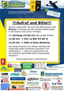 Wie bereits erwähnt haben unsere MJC und MJB am Sonntag, dem 15.05.2022 ihr letztes Saisonspiel in der Sachsen-Anhalt Liga. Beide kämpfen somit noch um den dritten Platz und haben noch Chancen auf eine Medaille im Kampf um die Landeskrone in Sachsen-Anhalt. Unterstützt unsere Jungs und würdigt die bisher sehr guten Leistungen mit einer vollen Halle. …