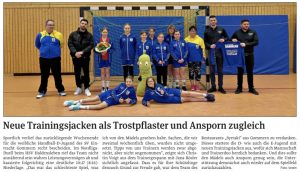 Einen doppelten Grund zur Freude hatte in den letzten Wochen unsere WJD. Mit dem Restaurant Syrtaki Gommern und der Maler Zahn GmbH stellten sich zwei Sponsoren der Mädels in der heimischen „Eintracht-Sporthalle“ vor und übergaben diverse Textilien. Unsere Mädels bedanken sich ausdrücklich und probieren beim morgigen Derby gegen den Güsener HC die ersten beiden Punkte …