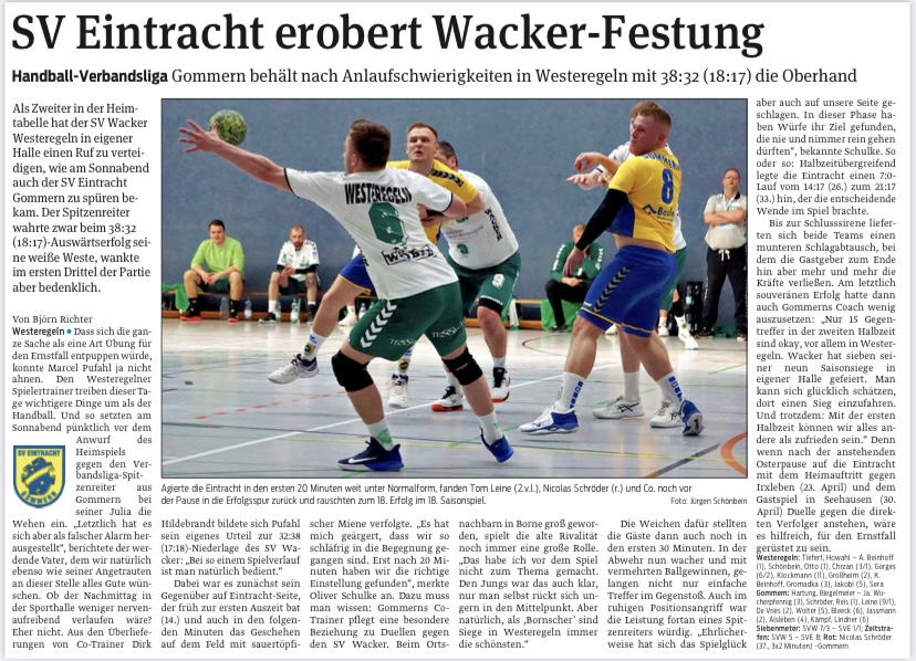 Beim heimstarken SV Wacker 09 Westeregeln reichte es zum nächsten Sieg, der am Ende mit 32:38 (17:18) deutlich ausfiel.